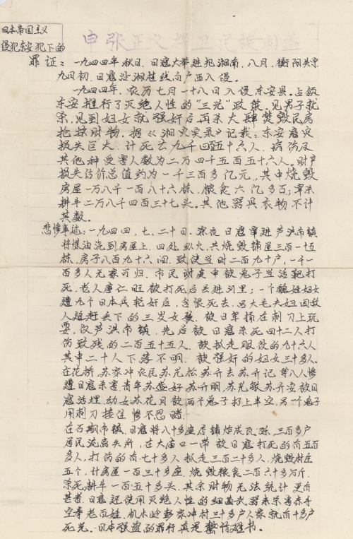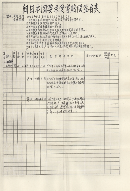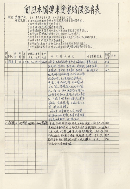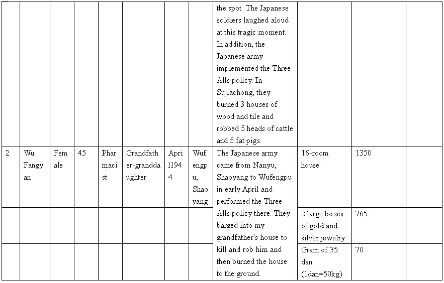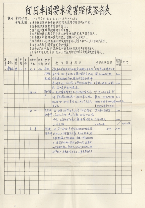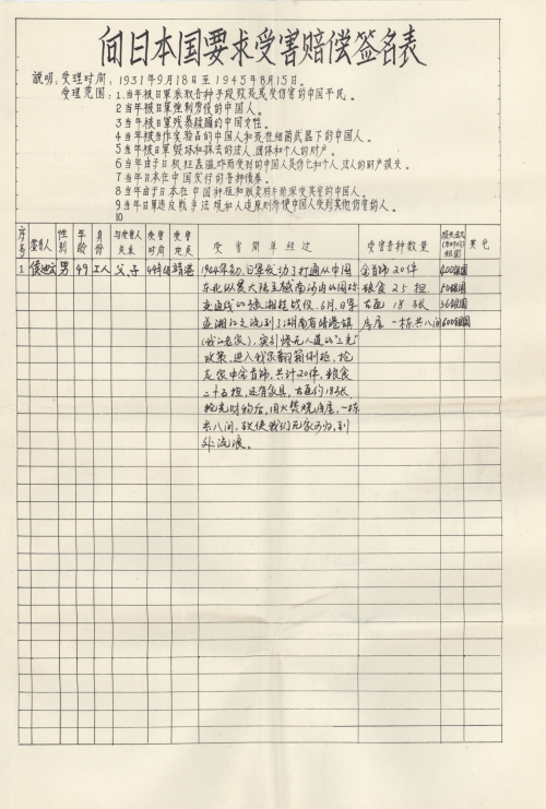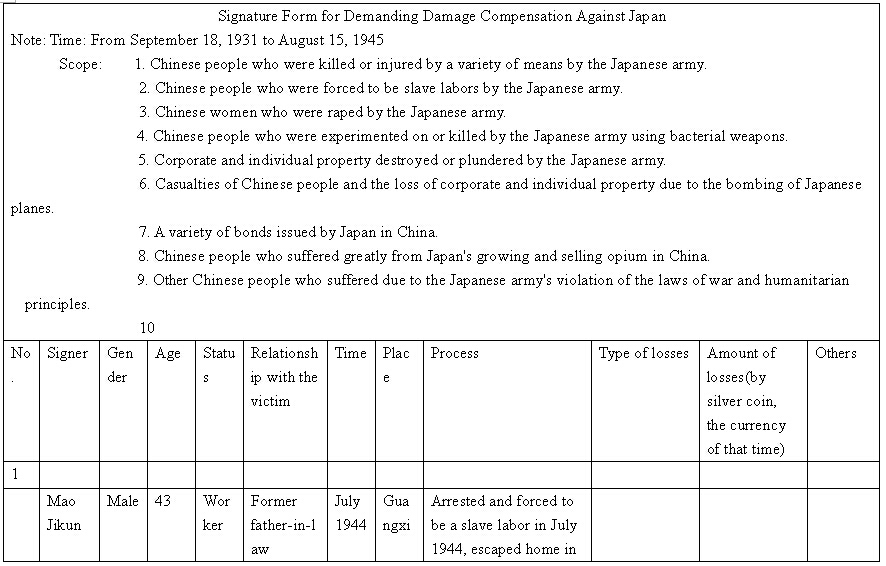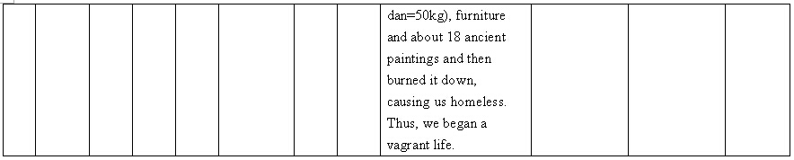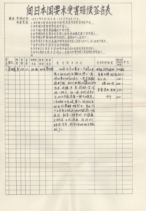 Other details:On July 20, 1944 on the lunar calendar, Japanese invaders splashed kerosene on houses and set fire, which burned hundreds of houses. Over 1000 people became homeless, they also uses living people as target and killed them, raped women and committed other towering crimes. Now I mail you the compensation signature form and brief description of persecution, and we demand the Japanese government must compensate all victims’ losses and apologize to victims.