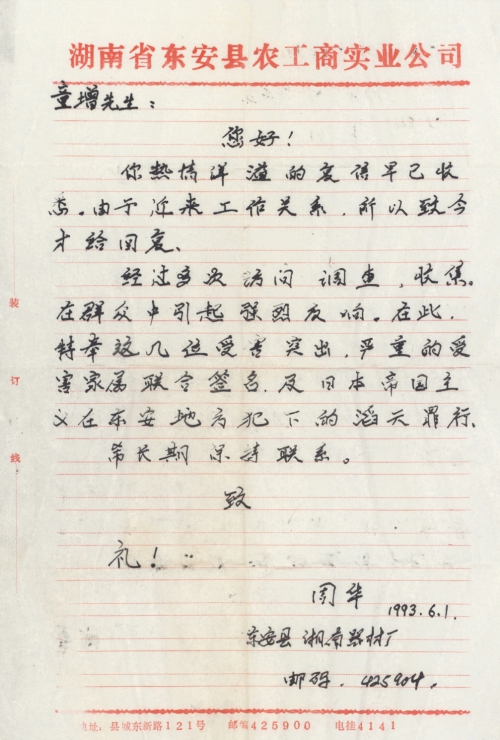 The survey shows that the signature campaign has been well received by the people. I am sending several articles written by the family members of victims, which describe heinous crimes that Japanese imperialism committed in Dong’an.