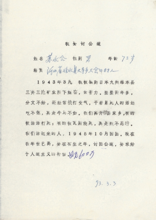 细节:1942年我被押送到达日本后在煤矿当劳工,每天吃不饱还干最重的工作如果偷懒就是挨打几乎每天都有不少劳工死亡我是这一批的幸存者。我要求日本政府赔偿。备注:信封丢失