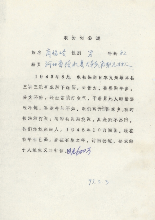 细节:1943年3月我被骗到日本做苦力两年多的时间里分文不给还经常挨打受气过不日子不如牛马。我要求日本政府给予补偿。备注:信封丢失
