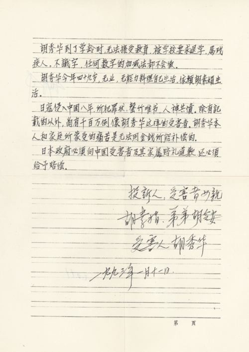 细节:1946年夏天日本宣布投降在回国的途中路过我地便进行歇斯底里的扫荡,到处开枪放炮胡秀华不仅被吓得精神失常房屋还被大火包围烧毁了。日本侵略中国的罪状比比皆是这是无法用金钱补偿的,日本政府必须向中国受害者及家属谢罪并赔偿。备注:信封丢失