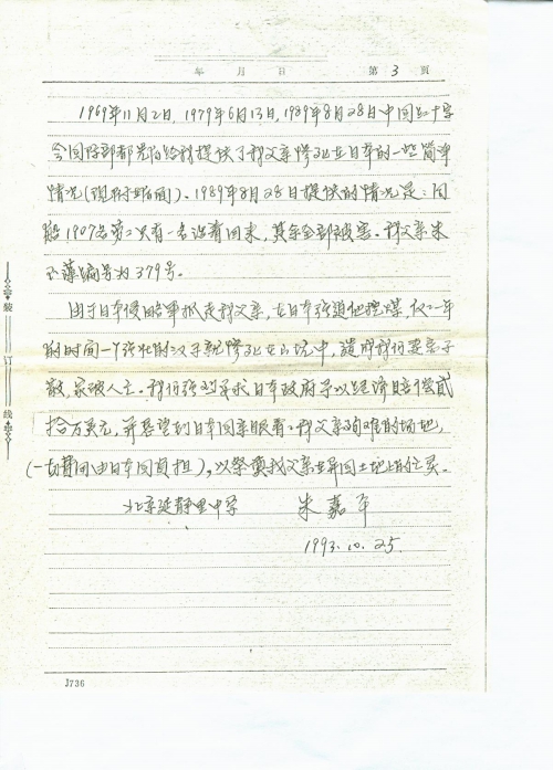 1969年11月2日,1979年6月13日,1989年8月28日中国红十字会国际部都先后给我提供了我父亲惨死在日本的一些简单情况(现附在后面)。1989年8月28日提供的情况是:同船1907名劳工只有一名活着回来,其余全部被害。我父亲朱玉藻编号为379号。
