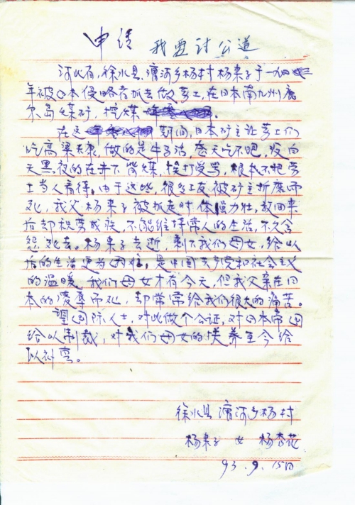 细节:杨来子1943年被日军抓去做劳工,在南九州鹿尔岛煤矿挖煤,挨打挨骂,很多工友被折磨死。备注:信封丢失