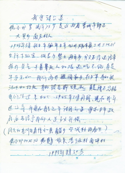 细节:杨小炉1943年被日军抓去做劳工,在日本挖窑,挨打挨骂,很多工友被折磨死,我希望在有生之年讨回公道。备注:信封丢失