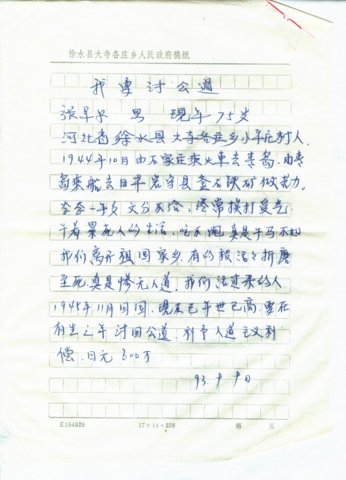 1944年10月由石家庄乘火车去青岛,由青岛乘船去日本岩手县釜石铁矿做苦力。整整一年多,分文不给,经常挨打受气,干着累死人的生活,吃不饱真是牛马不如,我们离开祖国家乡,有的被活活折磨致死,真是惨无人道。我们活过来的人,1945年11月回国,现在已年[事]已高,要在有生之年讨回公道,补予人道主义补偿,日元600万。