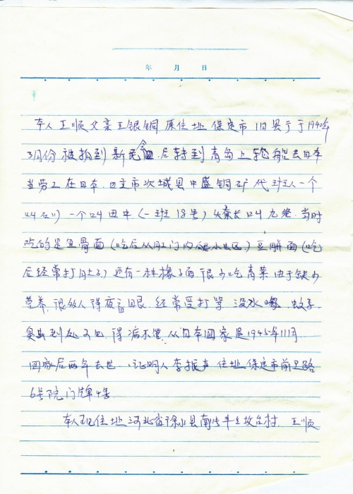本人王顺父亲王银铜,原住址保定市旧县街,于1942年3月份被抓到新民会,后转到青岛上轮船去日本当劳工,在日本日立市[茨]城县中盛铜矿,代班一个叫石川,一个叫田中(一班18号),燎长叫九瓷,当时吃的是鱼骨面(吃后从肛门内爬小蛆)、豆饼面(吃后经常打肚子),还有一种橡子面,很少吃青菜,由于缺少营养,很多人得夜盲眼,经常受打骂,没水喝,蚊子臭虫到处可见,得病不管,从日本回家是1945年11月,回家后两年去世,证明人李振声,住址保定市前卫路6号院门牌4号。