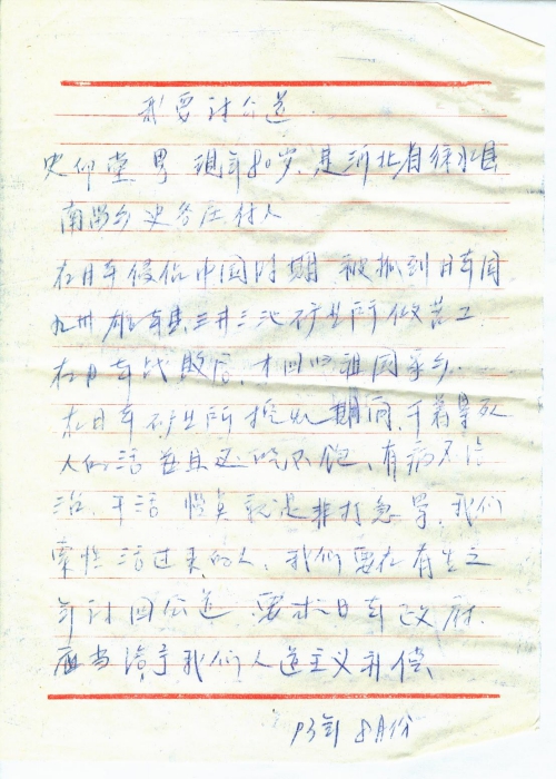 21 10 月, 2018 s3454 Share EmailTwitterFacebookGoogle +PinterestTumblrLinkedinVkontakte 信扫描序列号:s3454 写信日期:1993-08 写信地址:河北省保定市徐水县 受害日期:信中没写 受害地址:河北省保定市徐水县 写信人:史印堂 受害人:史印堂 类别:劳工(SL) 细节:被日军抓去日本九州熊本县做劳工,在日本挨打挨骂,很多工友被折磨死,日本战败后才回国,希望有生之年讨回公道。备注:信封丢失 我要讨公道 史印堂,男,现年80岁,是河北省徐水县南留乡史各庄村人。 在日本侵占中国时期,被抓到日本国九州[熊]本县三井三池矿业所做苦工,在日本战败后,才回归祖国家乡,在日本矿业所挖煤期间,干着累死人的活,并且还吃不饱,有病不给治,干活慢点就是非打[即]骂,我们索性活过来的人,我们要在有生之年讨回公道,要求日本政府应当给予我们人道主义补偿。 93年8月份 21 10 月, 2018 10000cfj_3o5som 劳工(SL)