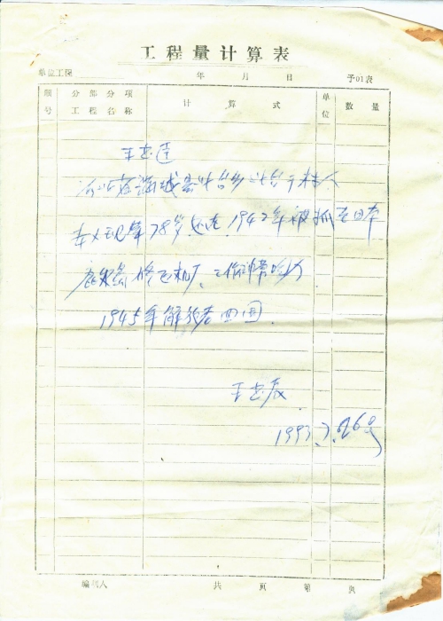 21 10 月, 2018 s3457 Share EmailTwitterFacebookGoogle +PinterestTumblrLinkedinVkontakte 信扫描序列号:s3457 写信日期:1993-07-26 写信地址:河北省保定市满城县 受害日期:1942-1945 受害地址:河北省保定市满城县 写信人:王书辰 受害人:王书辰(臣) 类别:劳工(SL) 细节:1942年被日军抓去做劳工,修飞机场,工作非常吃力,1945年才回国。备注:信封丢失 王书臣,河北省满城县叶台乡叶台子村人。 本人现年78岁,还在1942年被抓去日本鹿儿岛修飞机厂,工作非常吃力。 1945年解放后回国。 王书辰 1993年7月26日 21 10 月, 2018 10000cfj_3o5som 劳工(SL)