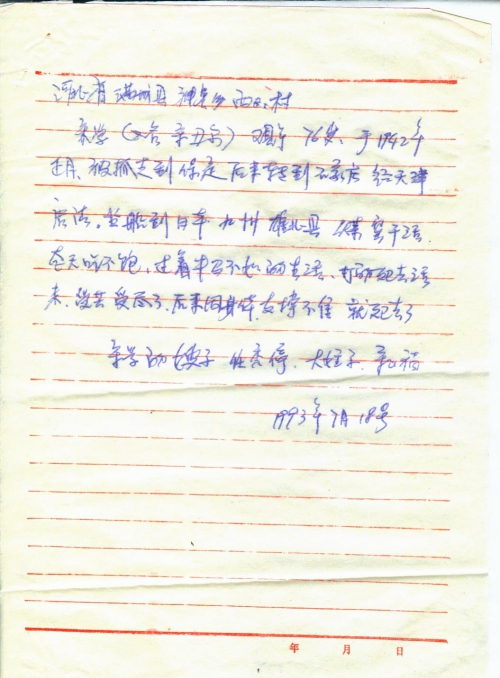 21 10 月, 2018 s3459 Share EmailTwitterFacebookGoogle +PinterestTumblrLinkedinVkontakte 信扫描序列号:s3459 写信日期:1993 写信地址:河北省保定市满城县 受害日期:1942-1945 受害地址:河北省保定市满城县 写信人:任秀停(宋学的嫂子) 受害人:宋学 类别:劳工(SL) 细节:1942年被日军抓去做劳工,在日本挨打挨骂,过着牛马不如的日子,最终身体不行死在日本。备注:信封丢失 河北省满城县神星乡西[峪]村 宋学(又名宋丑尔),现年76岁,于1942年正月,被抓走到保定,后来转到石家庄,经天津塘沽,坐船到日本九州[熊]本县煤窑干活,整天吃不饱,过着牛马不如的生活,打的死去活来,受苦受尽了,后来因身体支撑不住,就死去了。 宋学的嫂子任秀停 大侄子 宋飞复 1993年7月18号 21 10 月, 2018 10000cfj_3o5som 劳工(SL)