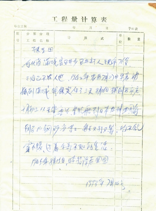 21 10 月, 2018 s3460 Share EmailTwitterFacebookGoogle +PinterestTumblrLinkedinVkontakte 信扫描序列号:s3460 写信日期:1993-07 写信地址:河北省保定市满城县 受害日期:1942-1945 受害地址:河北省保定市满城县 写信人:信中没写 受害人:孙玉田 类别:劳工(SL) 细节:1942年被日军抓去后送到日本九州做劳工,在日本挨打挨骂,吃不饱穿不暖,1945年才回国,现在已经不在世。备注:信封丢失 孙玉田 河北省满城县石井乡石井村人,现年76岁。 现已不在人世,1942年农历7月27日,早晨被抓到满城转保定住了三天,8月16日押到石家庄,十月初三从天津塘沽坐轮船到日本九州四国岛,别子川钢矿当苦工,每天又打又骂,吃不饱,穿不暖,过着牛马不如的生活。 1945年8月15日,日本投降后回国。 1993年7月14日 21 10 月, 2018 10000cfj_3o5som 劳工(SL)