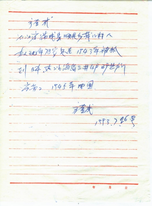21 10 月, 2018 s3472 Share EmailTwitterFacebookGoogle +PinterestTumblrLinkedinVkontakte 信扫描序列号:s3472 写信日期:1993-07 写信地址:河北省保定市满城县 受害日期:1943-1945 受害地址:河北省保定市满城县 写信人:方金成 受害人:方金成 类别:劳工(SL) 细节:1943年被日军抓去后送到日本北海岛三井做劳工,1945年才回国。备注:信封丢失 方金成 河北省满城县顺民乡茂山村人 本人现年78岁,还在,1943年被抓到日本,在北海[道]三井炉矿业所当劳工,1945年回国。 方金成 1993年7月26日 21 10 月, 2018 10000cfj_3o5som 劳工(SL)
