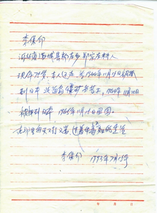 21 10 月, 2018 s3478 Share EmailTwitterFacebookGoogle +PinterestTumblrLinkedinVkontakte 信扫描序列号:s3478 写信日期:1993-07 写信地址:河北省保定市满城县 受害日期:1944-1945 受害地址:河北省保定市满城县 写信人:李保印 受害人:李保印 类别:劳工(SL) 细节:1944年被日军抓去后送到日本北海岛做劳工,在日本挨打挨骂,1945年才回国。备注:信封丢失 李保印 河北省满城县柳庄乡郑家佐村人 现年75岁,本人还在,于1944年11月15日被抓到日本北海[道]煤矿当苦工,1944年11月20日被押到日本,1945年11月15日回国。在那里每天又打又骂,过着牛马还不如的生活。 李保印 1993年7月15号 21 10 月, 2018 10000cfj_3o5som 劳工(SL)
