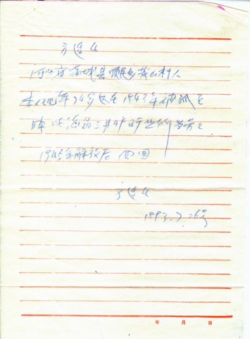21 10 月, 2018 s3480 Share EmailTwitterFacebookGoogle +PinterestTumblrLinkedinVkontakte 信扫描序列号:s3480 写信日期:1993-07 写信地址:河北省保定市满城县 受害日期:1943-1945 受害地址:河北省保定市满城县 写信人:方适火 受害人:方适火 类别:劳工(SL) 细节:1943年被日军抓去后送到日本北海岛三井矿业所做劳工,1945年才回国。备注:信封丢失 方适火 河北省满城县顺民乡茂山村人 本人现年74岁,还在,1943年被抓至日本北海[道]三井炉矿业所当劳工。1945年解放后回国。 方适火 1993年7月26日 21 10 月, 2018 10000cfj_3o5som 劳工(SL)