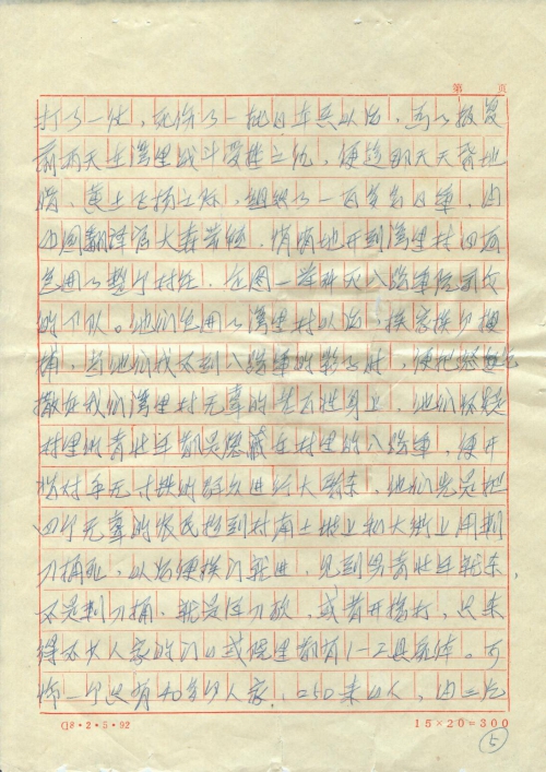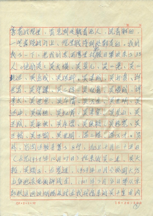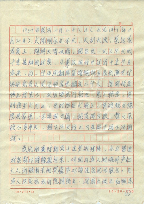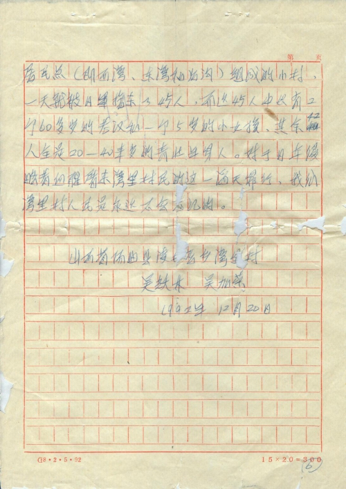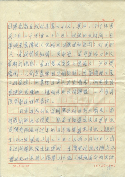 Other details:On October 28, 1937, about 110 Japanese soldiers came to our village, and they killed everyone they met. In November 1939 Xu Chengquan was captured and killed; in 1941 Wu Shijin was killed. Our village suffered from the killing of the Japanese Army who killed many of our villagers. Note: The envelope is missing