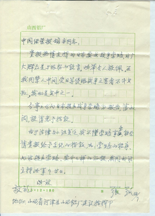 贵报热情支持向日本要求战争索赔,对广大群众是个很好的教育。此举令人敬佩。在我同辈人中间,受日军侵略战争之害者不计其数,我也是其中之一。