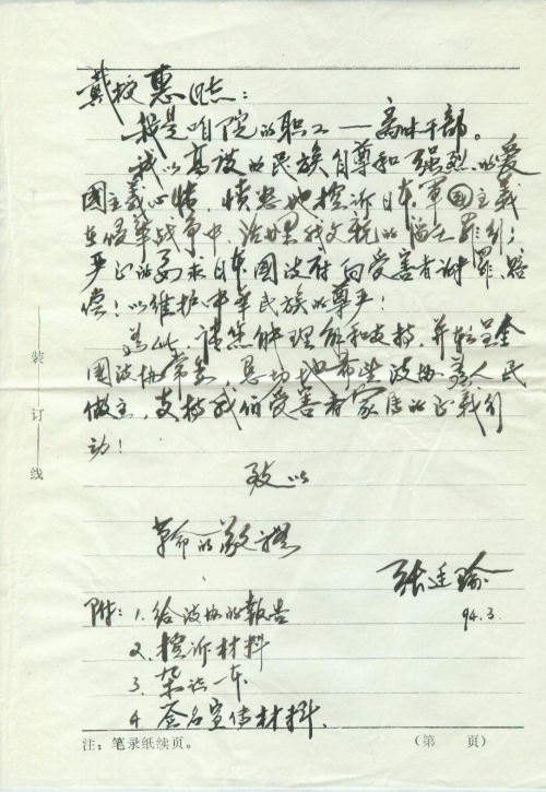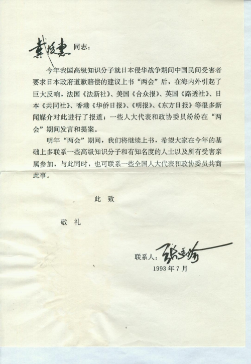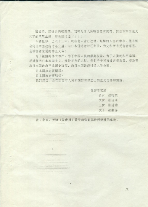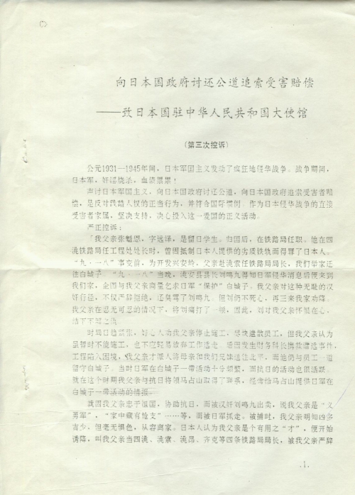 I hereby demand justice and compensation from the Japanese government, which is a just act that protests against trampling human rights and is in line with international practice. As a family member of a direct victim of Japan’s war of aggression against China, I am determined to support and participate in this patriotic, just activity.