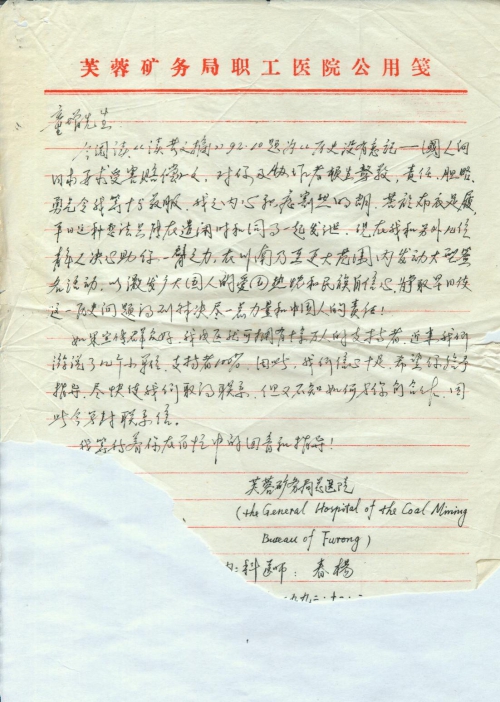 今阅读《读者文摘》92.10题为《历史没有忘记——国人向日本要求受害赔偿》一文,对你及协作者顿生擎敬,责任、胆略、勇气令我等十分敬服,我之内心积虑豁然明朗,苦于布衣足履,平日这种想法只能在遣闲时和同事一起发泄,现在我和另外几位青年人决心助你一臂之力,在川南乃至更大范围内发动大型签名活动,以激发广大国人的爱国热忱和民族自信心,为争取早日使这一历史问题得到解决,尽一点力量和中国人的责任!