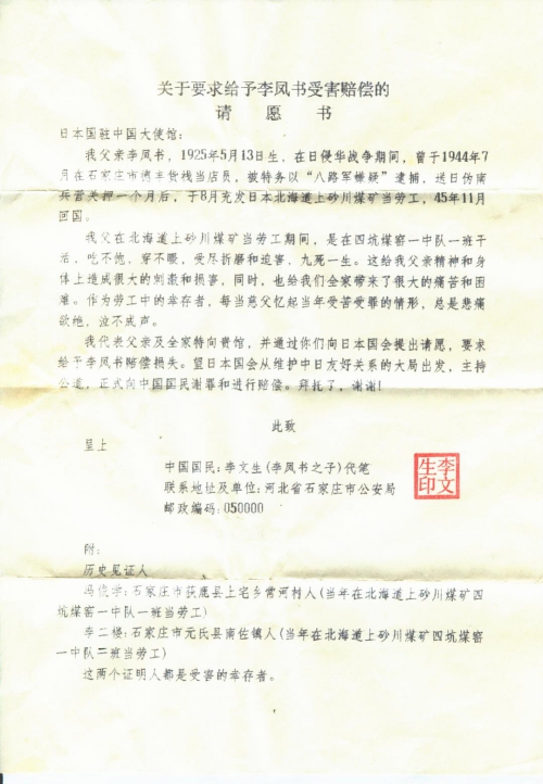 我代表父亲及全家特向贵馆,并通过你们向日本国会提出请愿,要求给予李凤书赔偿损失。望日本国会从维护中日友好关系的大局出发,主持公道,正式向中国国民谢罪和进行赔偿。拜托了,谢谢!