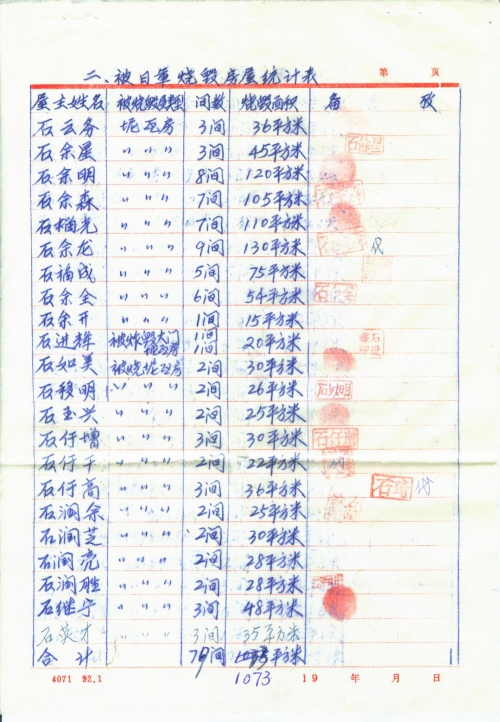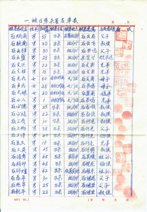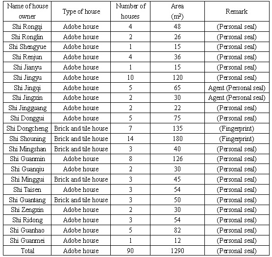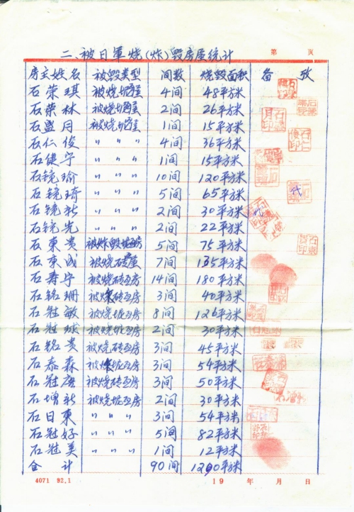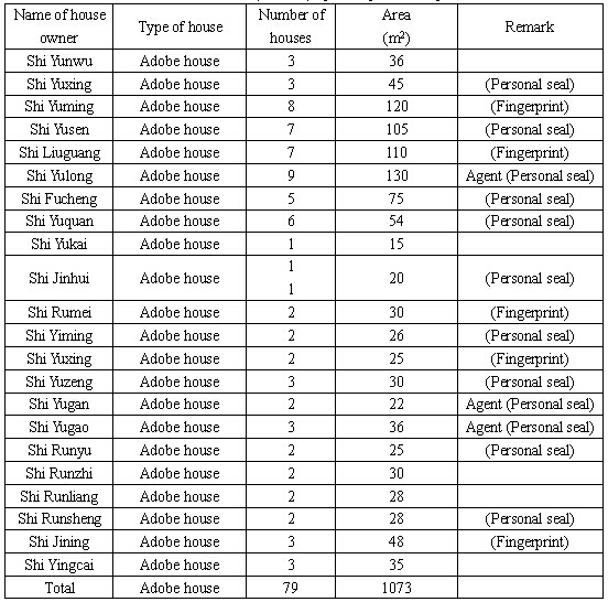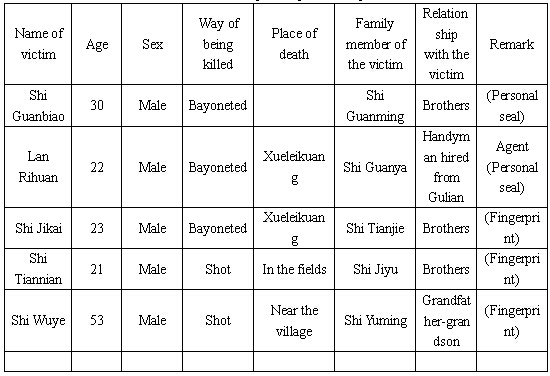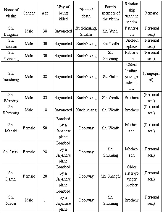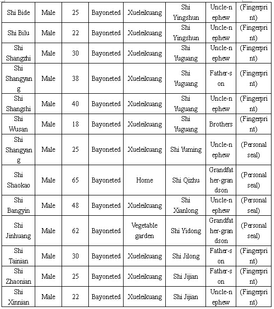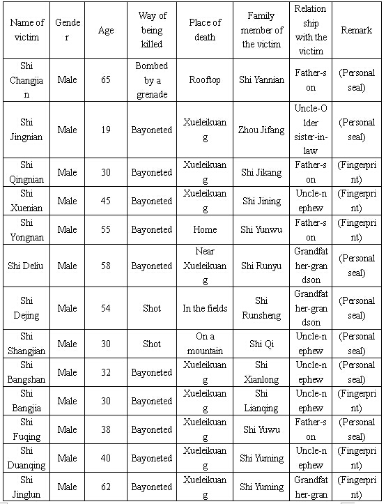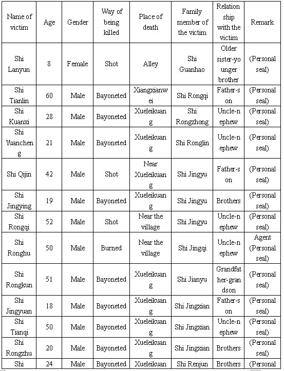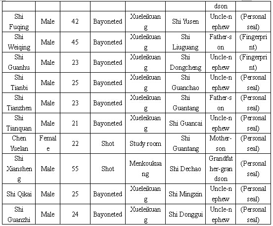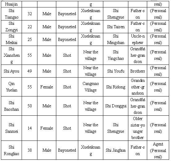 After Xiangxian fell in the winter of 1939 during Japan’s war of aggression against China, 74 people (including 67 males and 7 females) from Shizhaizhuang were killed by the Japanese army, and 232 houses with a total area of 3,159 square meters were burned, along with other losses (including grain, clothes, cattle, pigs, chicken and ducks, etc.). Therefore, we strongly demand compensation from Japan.