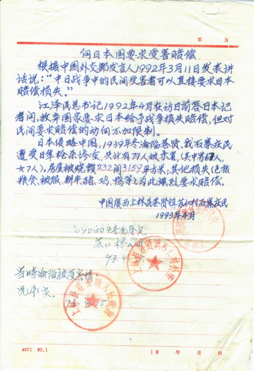 The Chinese Foreign Ministry spokesman made a speech on March 11, 1992, “The civilian victims during the Sino-Japanese war can directly demand damage compensation from Japan.”