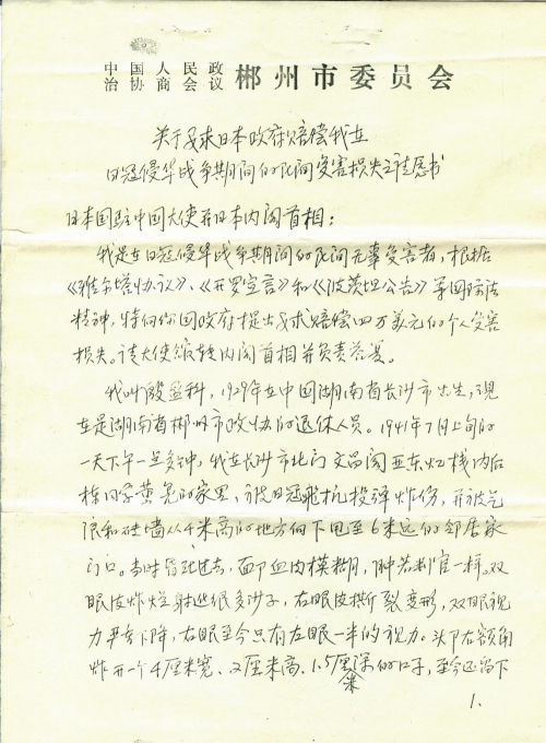 Petition Demanding Damage Compensation from Japan for My Losses during Japan’s War of Aggression Against China