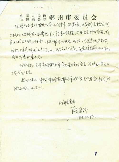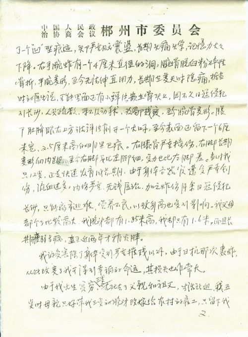 I am sending my wound pictures and evidence with the letter and can provide information about witnesses if an investigation is required. If you need to check any information promptly, please call my house number: 254690. The long-distance district code of Chenzhou is 0735. To make a long-distance call, you may dial 0735 before the house number. So it is 0735254690. If a face-to-face interview is needed, you may send someone here or I may go to Beijing.