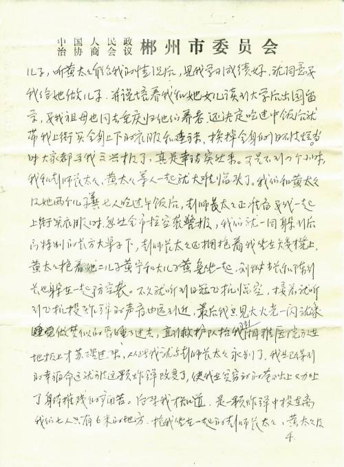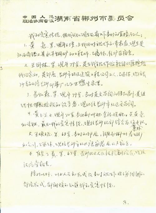 3. Yi Hesen, male, now 79. He was then vice-captain of the security team of Wenchangge, a leader who organized rescue for us and now still lives in Wenchangge, Bei District, Changsha.