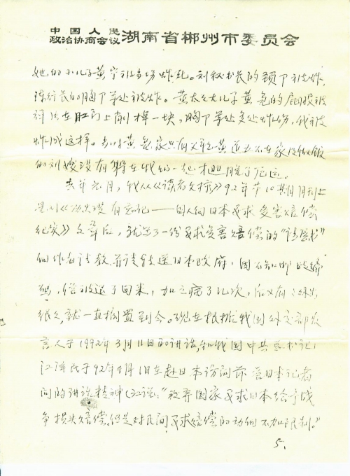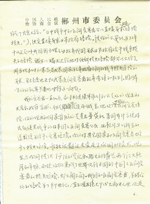 Last lunar January, after reading the article History Is Not Forgotten: Records of Chinese People Demanding Damage Compensation from Japan from the Issue 10 of the monthly magazine Reader’s Digest of 1992, I sent you a letter of petition demanding damage compensation to seek your guidance and requested you forward it to the Japanese government. But the letter was returned due to the lack of a postal code. Later, I was sick for several times and then was out to handle other matters, so the letter was delayed until now. I decide to directly demand compensation from the Japanese government according to the speech of the Chinese Foreign Ministry Spokesman on March 11, 1992 and the answer the Communist Party General Secretary Jiang Zemin gave to the Japanese reporter before his visit to Japan on April 1, 1992 (in which Jiang said, “The Chinese government gave up war reparations against Japan, but doesn’t restrict the people from demanding compensation from Japan.” The Chinese Foreign Ministry Spokesman said, “The civil victims during the Sino-Japanese war can directly demand compensation from Japan.”) Please don’t deny any compensation claim with the excuse that Prime Minister Zhou had actively given up war reparations against your government. Prime Minister Zhou only gave up war reparations between governments on behalf of the Chinese government, but he was not authorized to give up damage compensation on behalf of civil victims. So I hope you can seriously address the issue.