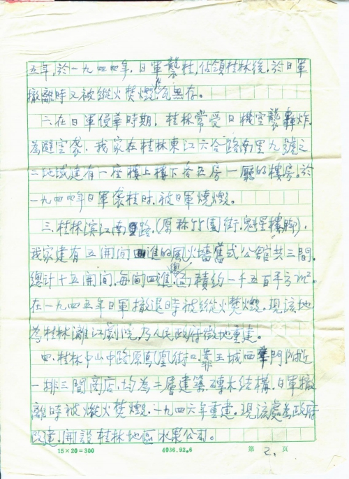 细节:我在桂林市的房屋在1939年被日军轰炸,1944年新建好房屋再次被日军烧毁,1945年我家的公馆被日军烧毁。备注:信封丢失