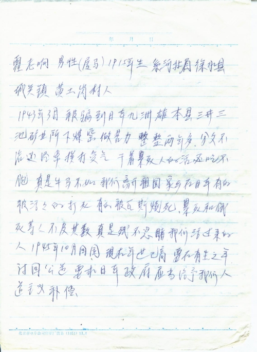 细节:1943年被骗到日本九州雄本县三井三池矿业下煤窑做苦力整两年多,分文不给,吃不饱,牛马不如,有的被打死,有的被瓦斯炸死,1945年才回国。备注:信封丢失