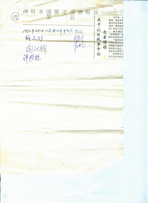 21 10 月, 2018 s3517 Share EmailTwitterFacebookGoogle +PinterestTumblrLinkedinVkontakte 信扫描序列号:s3517 写信日期:1992-07-04 写信地址:江苏省常州市溧阳市 受害日期:信中没写 受害地址:信中没写 写信人:贺文德 受害人:贺文德、胡文珍、周惠珍等6人 类别:其它(OT) 细节:寄来支持对日索赔的6位受害者签名。 童增同志: 来函收到,经多方走访在日本侵华战争中民间生命财产遭受日军严重受害者6人。并将签名单寄上。 此致 敬礼! 贺文德 92.7.4 通讯地址:江苏溧阳市中医院离休干部 向日本国要求受害赔偿签名 1992年6月2日江苏溧阳市中医院 贺文德 胡文珍 周惠珍 陶汉镕 桂轸红 潘珍妹 21 10 月, 2018 10000cfj_3o5som 其它(OT)