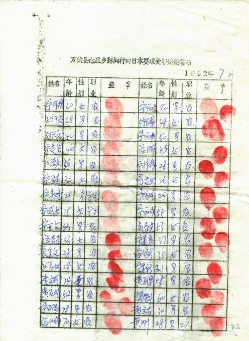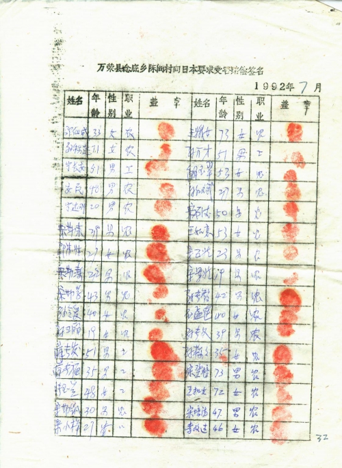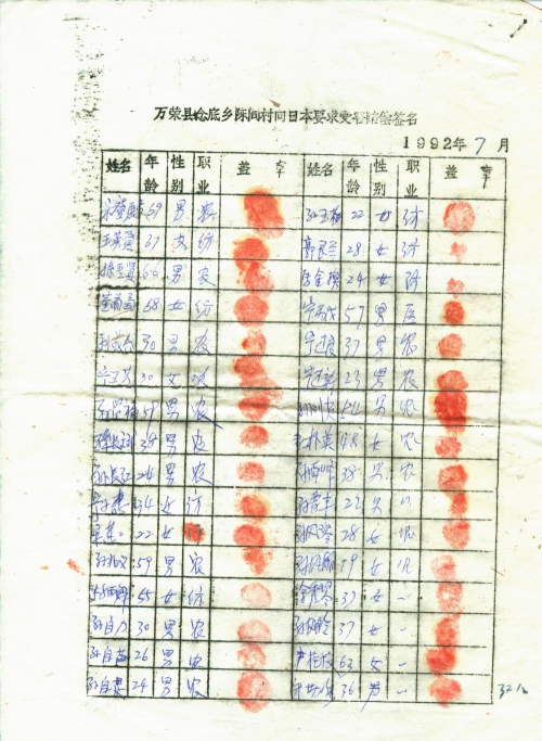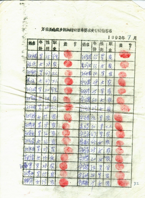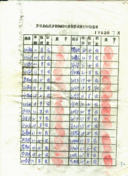21 10 月, 2018 s3525 Share EmailTwitterFacebookGoogle +PinterestTumblrLinkedinVkontakte 信扫描序列号:s3525 写信日期:1992-07 写信地址:山西省运城市万荣县 受害日期:信中没写 受害地址:山西省运城市万荣县 写信人:不详 受害人:万荣县百姓 类别:其它(OT) 细节:寄来向日本索赔签名表。备注:信封丢失 万荣县埝底乡陈阎陈向日本要求受害赔偿签名 1992年7月 万荣县埝底乡陈阎陈向日本要求受害赔偿签名 1992年7月 万荣县埝底乡陈阎陈向日本要求受害赔偿签名 1992年7月 荣县埝底乡陈阎陈向日本要求受害赔偿签名 1992年7月 荣县埝底乡陈阎陈向日本要求受害赔偿签名 1992年7月 21 10 月, 2018 10000cfj_3o5som 其它(OT)