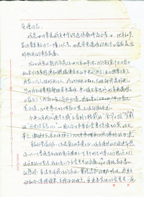 21 10 月, 2018 s3526 Share EmailTwitterFacebookGoogle +PinterestTumblrLinkedinVkontakte 信扫描序列号:s3526 写信日期:1992-11 写信地址:四川省自贡市荣县 受害日期:1939-08 受害地址:四川省乐山市 写信人:高永寿 受害人:高永寿的祖父、叔叔、姐姐 类别:轰炸(AB) 细节:我是日军轰炸的幸存者,1939年8月日军轰炸乐山市,祖母、叔叔、大姐被炸死。我支持您的观点,并连同其它受害者一起为索赔这一要求做事,请您回信。 21 10 月, 2018 10000cfj_3o5som 轰炸(AB)