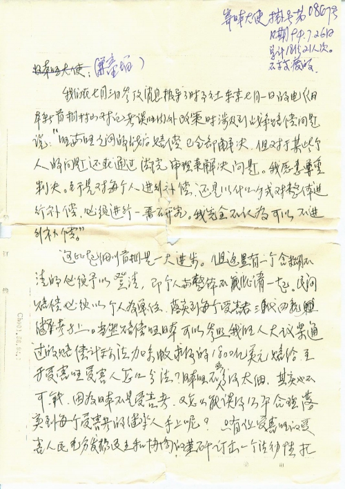 特请日本国政府严肃考虑赔偿,以利中日友谊永存。