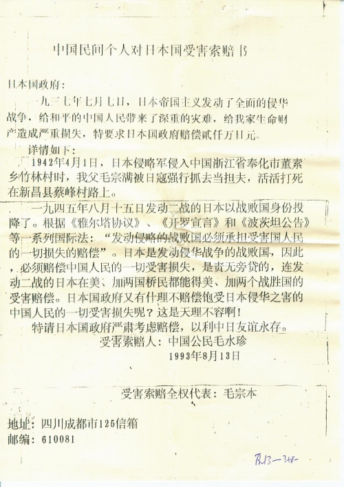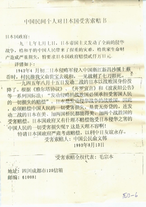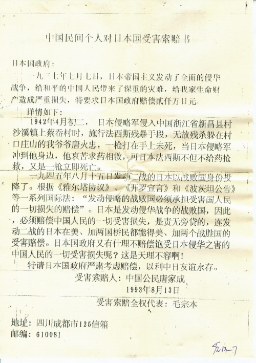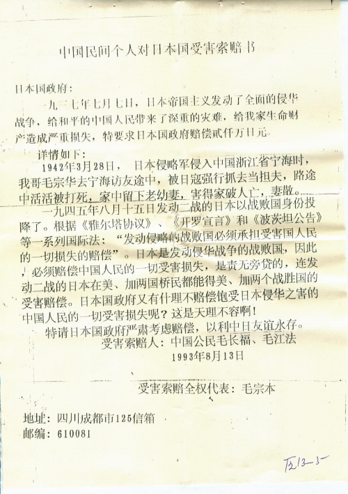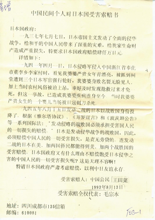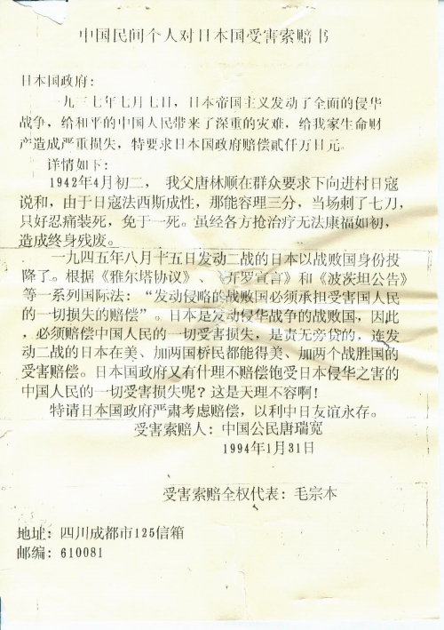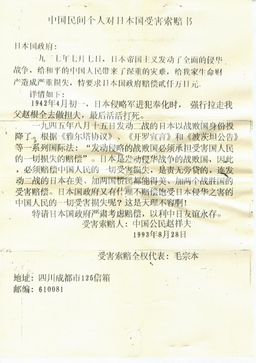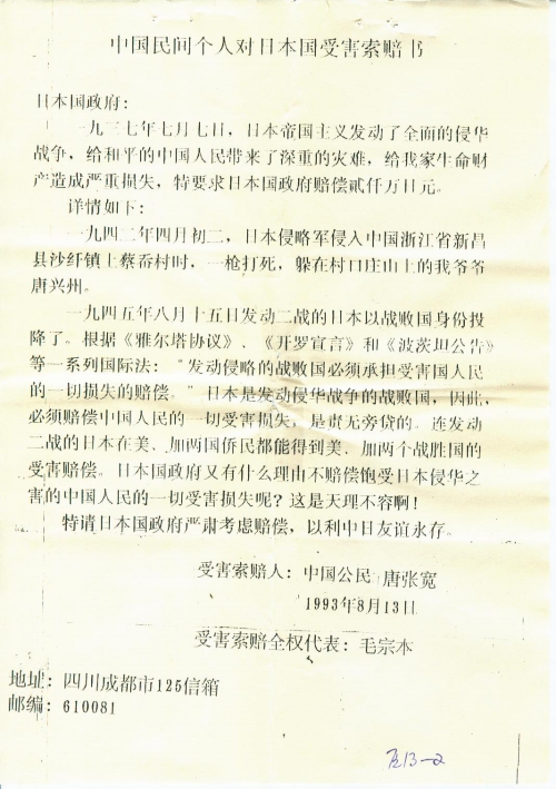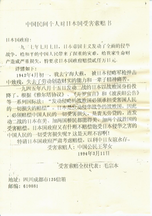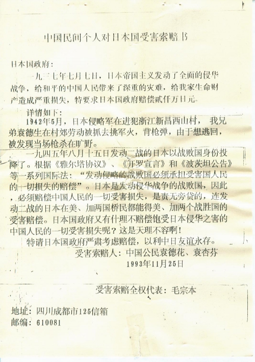 中国民间个人对日本国受害索赔书