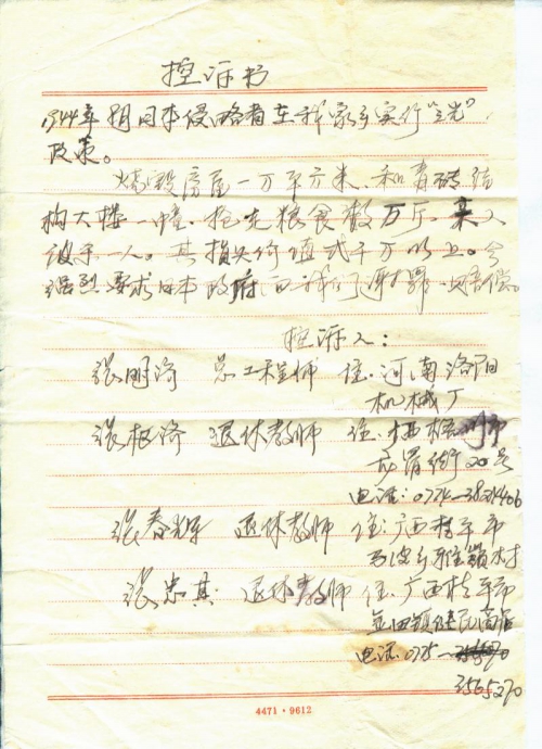 21 10 月, 2018 s3528 Share EmailTwitterFacebookGoogle +PinterestTumblrLinkedinVkontakte 信扫描序列号:s3528 写信日期:信中没写 写信地址:河南省洛阳市 受害日期:1944-08 受害地址:河南省洛阳市 写信人:张明济、张枢济、张春辉、张忠其 受害人:张明济、张枢济、张春辉、张忠其 类别:其它(OT) 细节:1944年8月日军烧毁我家中房屋,要求日本赔偿。 控诉书 1944年8月日本侵略者在我家乡实行“三光”政策。 烧毁房屋一万平方米,和青砖结构大楼一幢,抢走粮食数万斤,亲人被杀一人。其损失价值贰千万以上。今强烈要求日本政府向我们谢罪赔偿。 控诉人: 电话:0775-3565270 21 10 月, 2018 10000cfj_3o5som 其它(OT)