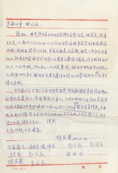 日本国内至今有人不承对华是侵略,修改教课书,参拜靖国神社,向国外派遣部队,梦想军国主义再起,中国和亚洲人民绝不答应。我们坚决要求日本当局赔偿中国人民1931-1945年日寇侵华受害损失,在此我和我的全家签名表示对你的活动的全力支持。还需怎样工作,我当尽力开展,请来信告知。