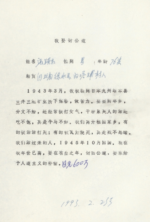 细节:1943年3月我被日军骗到日本做苦力,干的牛马活还吃不饱经常挨打受气甚至有些人被日寇活活打死和烧死。现我要求日方赔偿损失。备注:信封丢失