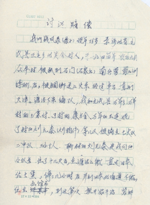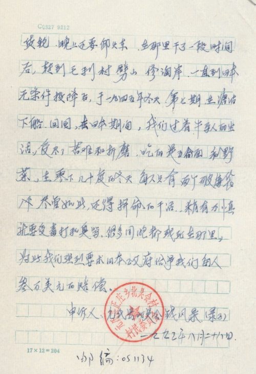细节:1944年农历9月我和同村的几个人一同被骗去日本做劳工,在日本期间我们过着非人的日子和苦难折磨吃的全是野菜稍有不慎就要遭受毒打因此我们强烈要求日本政府给予我们每人赔偿。备注:信封丢失