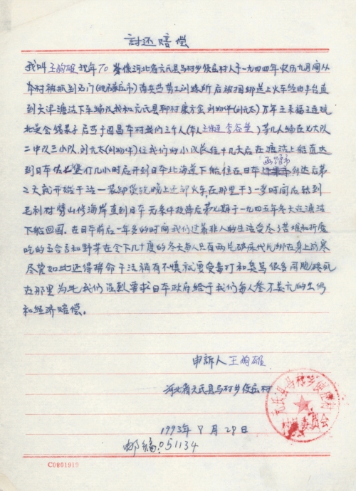 我叫王狗雄,现年70岁,系河北省元氏县马村乡使庄村人,于一九四四年农历九月间,从本村被抓到石门(现石家庄市)南兵营劳工训练所,后被捆绑送上火车经由丰台直到天津塘沽下车编队,我和元氏县聊村康方金、刘物件(刘元太)万年王来福、王连妮、北吴会钱录子,后营于国昌本村,我们三个人(本人王保连、李谷垒)等几人编在七大队二中队三小队,刘元太(刘物件)任我们的小队长,住十几天后在塘沽上船,直达到日本佐七堡停几小时,后开到日本北海道下船住在日本函馆市,到达后第二天就开始干活——装卸货轮,晚上还卸货车,在那里干了一段时间后,转到毛利村劈山修海岸,直到日本无条件投降后第七期于一九四五年冬天在塘沽下船回国。在日本前后一年多的时间,我们过着非人的生活,受尽了苦难和折磨,吃的五合面和野菜,在[零]下几十度的冬天,每人只有两片破麻代片绑在身上防寒,尽管如此,还得拼命干活,稍有不慎就要受毒打和臭骂,很多同胞[惨]死在那里,为此我们强烈要求日本政府给予我们每人叁万美元的工资和经济赔偿。