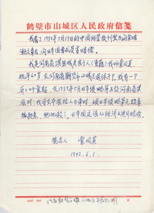 我看了1992年5月19日的中国经营报刊登民间索赔潮文章后,向日本国要求受害赔偿。