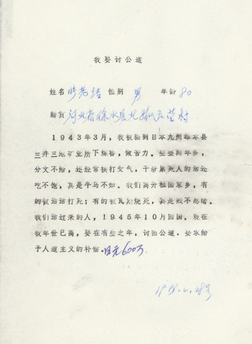 细节:1943年3月我被日军骗到日本在三井三池矿业所挖煤窑做劳工两年多,他们分文不给还经常打骂我们,每天干着累死人的活还吃不饱,有的中国劳工被活活打死,有的被瓦斯烧死。我要在有生之年讨回公道,我要求日本政府给予赔偿。备注:信封丢失