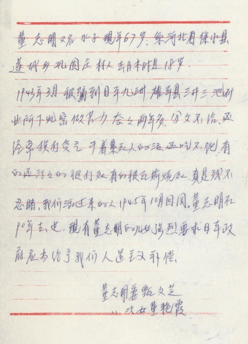 细节:我的父亲在1943年3月被骗到日本做苦力2年多分文不给干着累死人的活吃不饱还经常挨打受气,有的被活活打死。我强烈要求日本政府赔偿我父亲。备注:信封丢失