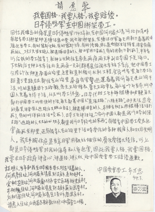细节:1942年初日本侵略军在河北省大清河扫荡抓了很多无故的百姓去日本做劳工我也是其中之一。在做劳工的日子里每天受日本工头的打骂冬天也不发棉衣病了也不给看病,许多同胞都死在了矿里。因此我强烈要求日本政府赔偿我并给中国劳工道歉。另附上几份劳工同胞的证明材料。备注:信封丢失