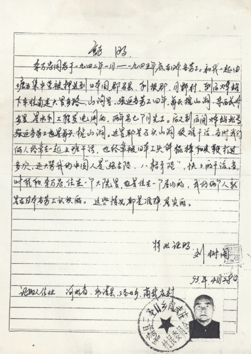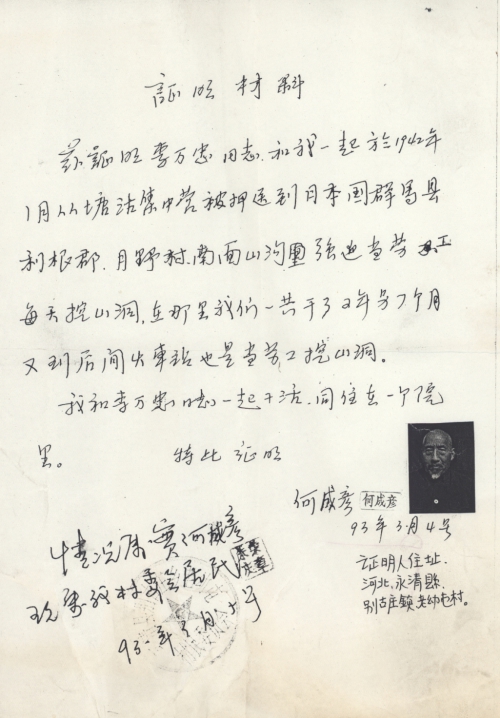 证明人:当年和我在日本国当劳工,现在活着的人。