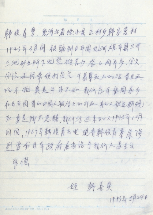 细节:我的叔叔1943年3月被骗到日本做劳工2年多,没有工钱每天干着累死人的活也吃不饱还经常挨打受气,有的人被活活打死。现我们强烈要求日本政府给予人道主义赔偿。备注:信封丢失