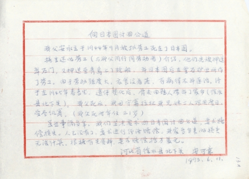 细节:1944年9月我父亲被押送到日本做苦力,由于劳动强度大衣食没找落1945年死在了日本。骨灰由熟人带回了家乡。我坚决要求日本国赔偿,我们必须讨回公道。备注:信封丢失