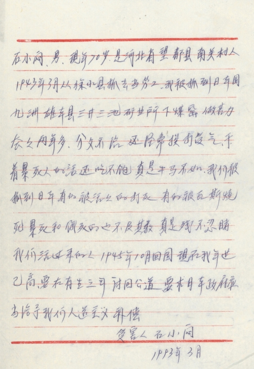 细节:1943年3月我被日军骗到日本在三井三池矿业所挖煤窑做劳工两年多,他们分文不给还经常打骂我们,每天干着累死人的活还吃不饱,有的中国劳工被活活打死,有的被瓦斯烧死。我要在有生之年讨回公道,我要求日本政府给予赔偿。备注:信封丢失