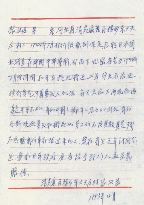 细节:1944年7月我们被抓到日本北海道的矿区下煤窑当苦力将近2年,分文不给每天吃不饱穿不暖还经常挨打受气有的人甚至活活被打死。我要在有生之年向日本国讨回公道。备注:信封丢失