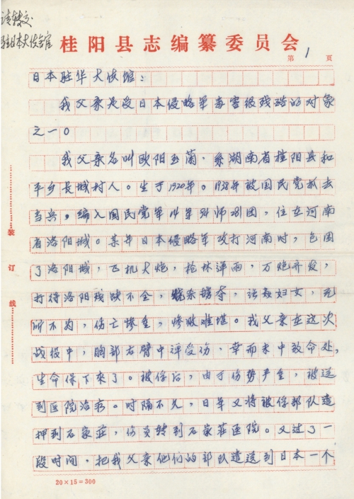 细节:1938年我父亲因在抗日战争中受伤被俘虏后又被押送到日本矿场做劳工,这期间吃不饱穿不暖还经常挨打工作量大导致本来就有伤在身的父亲患严重的胃病。父亲在日本受尽了日军的摧残我们兄妹5人要求日本政府赔偿。备注:信封丢失